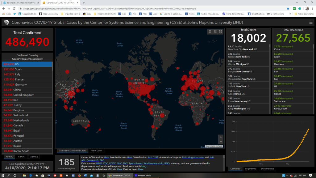 Living in the time of the novel coronavirus (COVID-19) is, to put it mildly, quite a challenge for most people, especially those of us who live in the United States. As I write this on the afternoon of April 10, there are 1,673,423 confirmed cases worldwide, with the U.S. in the not-so-great spot of being No. 1 in number of people with COVID-19: 486,490, of whom 18,002 (the size of an average infantry division in the Army) are dead. And although there are signs that the “curve of infection” is leveling off in some parts of the country, the number of cases (and fatalities) is still climbing.