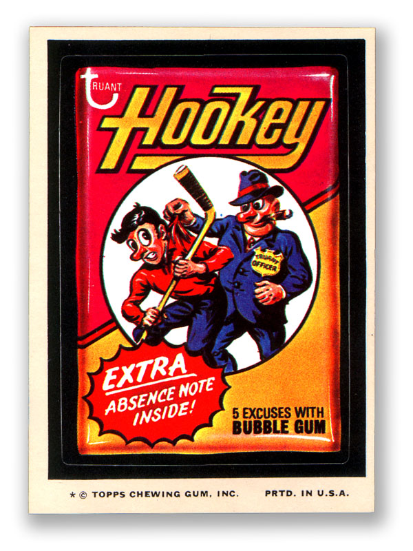 What I found interesting is that the merry pranksters at Topps even spoofed their company’s products; there’s a Kong Fu trading cards Wacky, a Planet of the Grapes trading cards Wacky, and a Wormy Packages Wacky. The jokes aimed at Topps are, of course, spins on the company’s name and product lines; Topps NFL Football cards are spoofed as Topsoil Sootball cards, and its NHL hockey trading cards are depicted as being Truant Hookey excuse notes, with “Extra! Absence Note Inside!” as a bonus!