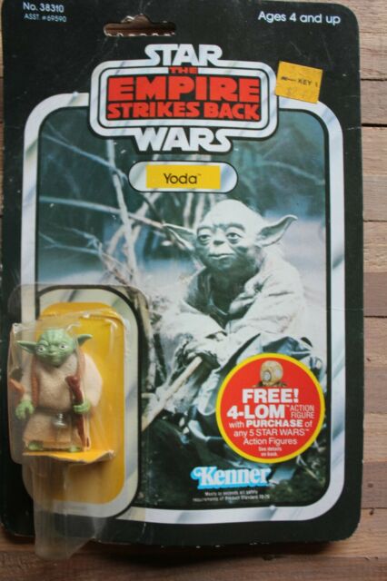 The 1980 figure – which came with a Day-Glo orange snake (some figures came with a chocolate brown one), a cane (called a “gimer stick”), a belt, and a cloth cloak – was first sold as Yoda; later iterations would be renamed as Yoda, The Jedi Master and sold, with variations in the cardback illustration, in Kenner’s The Empire Strikes Back, Return of the Jedi, Power of the Force, and Tri-Logo collections between 1981 and 1985.