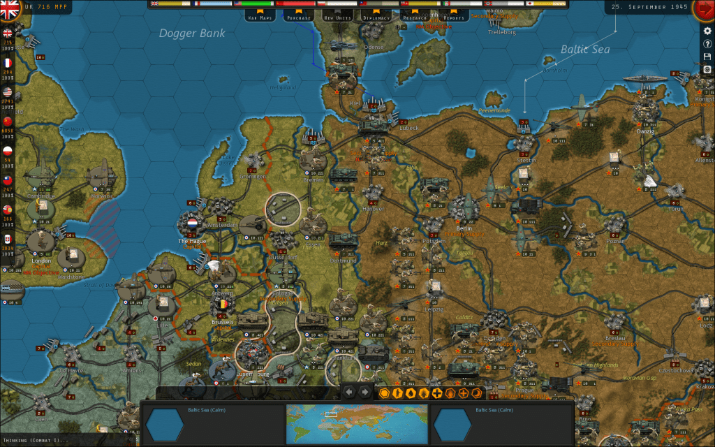 For instance, if you’re playing as the Axis powers (Germany, Italy, and Japan), the victory conditions for the 1939 World at War campaign state that you must control Berlin, Paris, London (and adjacent hexes), Manchester, Moscow, Stalingrad, Cairo, Tokyo, Seoul, Chungking, Delhi, Manila, and Canberra in order to win a decisive victory.