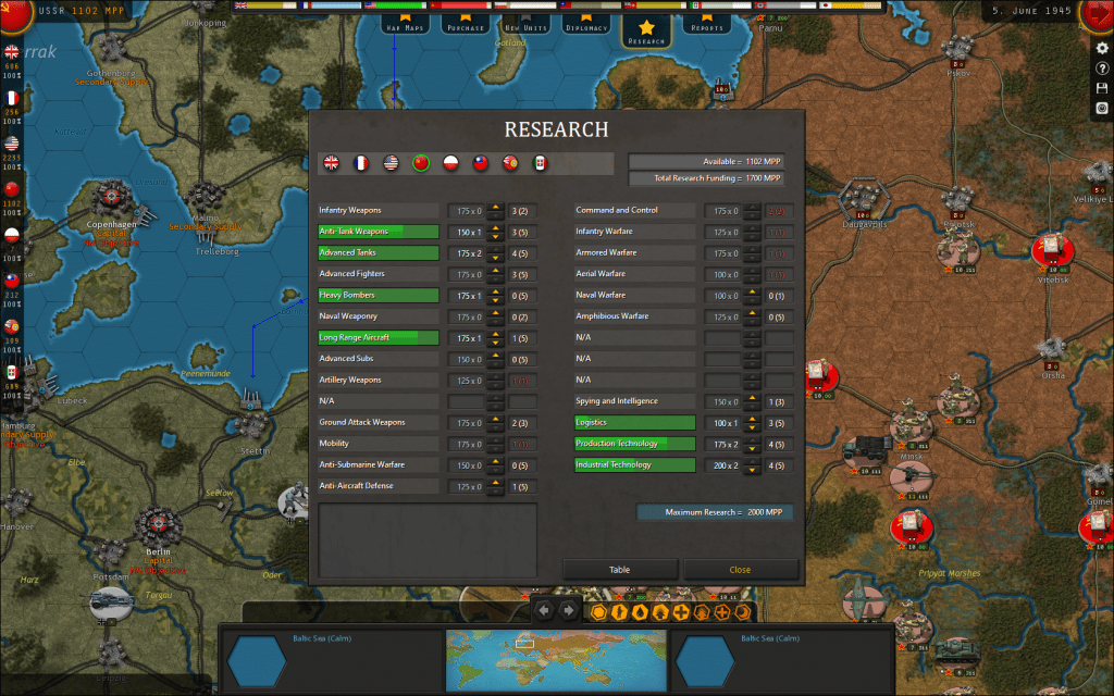 First, the game starts with each country already carrying out some R&D; depending on the nationality and its level of industrial capacity, your bureaucrats, scientists, and inventors will work hard to develop new techs and improve industrial and logistics methods. It’s up to you, though, to increase R&D spending (or not) and in what categories. Based on historical reality, some countries can develop specific weapons that others can’t. Per the Strategic Command WWII: World at War manual:
