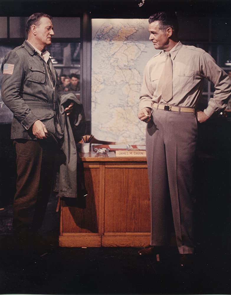 (Another case of casting gone wrong was when Robert Ryan, then 55, was chosen to play the 82nd Airborne’s assistant division commander, Brigadier Gen. James M. Gavin. Ryan was a good actor who had worked with Wayne in other war films, but he looked nothing like the boyish brigadier who was one of the first U.S. generals to land during the night-time airborne drop on Normandy,)