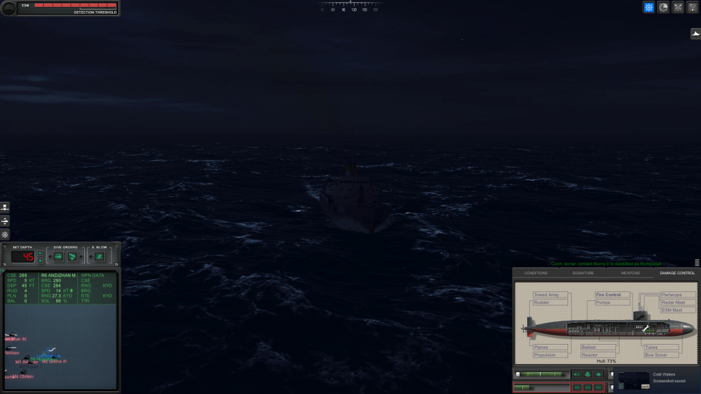 I used to employ the same tactics when I played Red Storm Rising, which had graphics that looked pokey in comparison to Cold Waters’ but had many of the same basic tactical concepts, and many of the warships simulated in the 1988 game appear here as well, although they are depicted more realistically in Cold Waters.