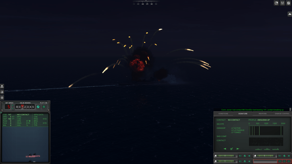 Now, I’m not going to write a long dissertation with a blow-by-blow description of the Battle of the Baltic. Suffice it to say, however, that I applied the lessons that I learned during the Training Scenarios  – including how to do a proper target motion analysis (TMA) during the pre-attack approach on a Soviet amphibious group, how to use my sensors properly, how to maneuver my boat whilst avoiding Soviet torpedoes, and how to prioritize damage control parties in the middle of a battle.