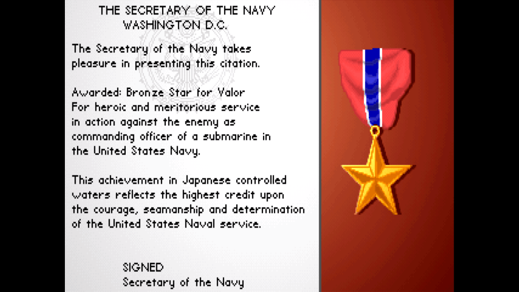 Also, in keeping with U.S. Navy command structures of the time, you started the game as a Lieutenant Commander (LCDR). After each mission or war patrol, the game would award you points based on the types of Japanese ships you sank or damaged, whether you achieved or failed the mission in your orders, or if you failed to engage the enemy at all. In War Patrols and War Careers, fuel management was considered. If, for instance, you successfully accomplished a war patrol in Japanese waters but had to be towed into Pearl Harbor (or any other U.S. sub base), you would get a letter letting you know that your commanding officer was not thrilled with you at the moment. If you performed well during the war and your record didn’t reflect any screwups, you could expect a promotion to full Commander, especially if you sank a juicy target (an aircraft carrier, say) and earned a medal higher than a Silver Star, such as the Distinguished Service Cross, the Navy Cross, or the Medal of Honor. At war’s end, depending on your war record and list of decorations, you could earn promotion to either Captain (CAPT) or even Rear Admiral (RADM).
