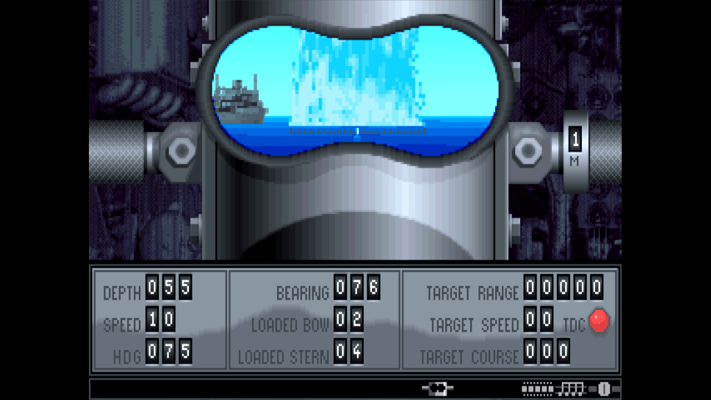 - Torpedo and Deck Gun Training, in which you practiced your torpedo firing procedures – including the use of the boat’s Torpedo Data Computer (TDC) and your two visual devices: the periscope and your target-bearing transmitter (TBT) binoculars – and aiming and firing your deck gun. In this mode, you had to sink four near-stationary hulks at a gunnery range near Midway Island
