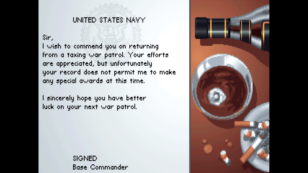 Again, a boat skipper is evaluated after each War Patrol upon return to base. Successful patrols earn players letters of commendation and medals. Unsuccessful missions and unproductive war patrols have negative outcomes, ranging from letters of reprimand to removal from command of a boat and assignment to a desk job. Really unlucky skippers in battle get their boat sunk with all hands and earn only a floating wreath on the waters.