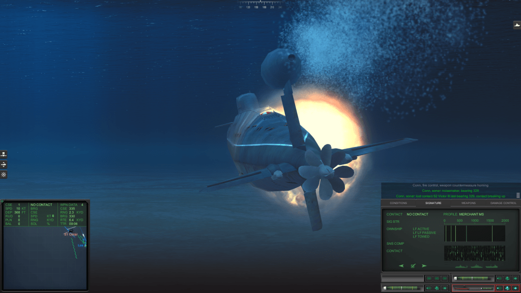I can’t say, exactly, how many Quick Battles I played today in Cold Waters. The game doesn’t keep tabs on Single Missions or Quick Battles; just in the Campaign games, where you are rated on your performance after every mission – if you survive, that is – and your successes (or failures) shape the course of the conflict you are in. Unlike Red Storm Rising, the game that inspired Killerfish Games to create Cold Waters, you only get a tally of the ships and subs you sink, your remaining weapons stores, and the status of your boat and its systems. (If you were sunk in a Quick Mission – and I was sunk twice today, you’re told what type of enemy weapon bagged you.)