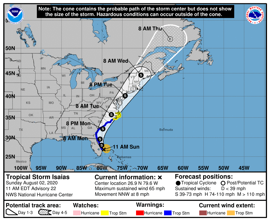 Isaias will move near the east coast of Florida today through late