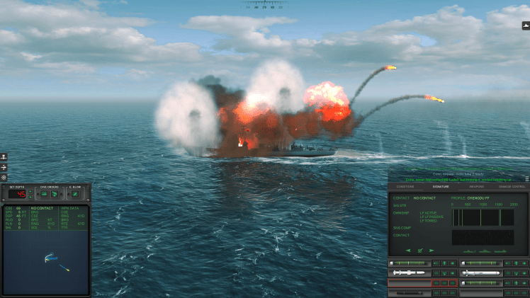 As it turned out, the ASW plane – I only saw a few glimpses of it when I was looking at camera views of the action on the surface, but I think it was a TU-142 Bear-F – did keep me busy evading sonobuoys, and it did damage my Seawolf with not one but two anti-submarine torpedoes.