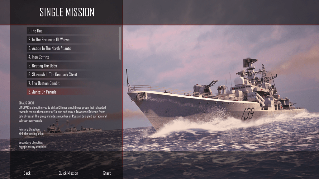 Before last night’s hour-long blackout, though, I managed to finally complete the Junks on Parade scenario in Cold Waters‘ Single Missions slate. It wasn’t easy; the mission takes place in the shallow waters off the coast of Taiwan, where the sea bottom lies 200 feet under the surface, and although the People’s LIberation Army Navy doesn’t have a Soviet fleet as backup – in this alternate history, the Hong Kong handover of 1997 never took place and the USSR still exists – it does have air cover for the convoy I had to intercept.