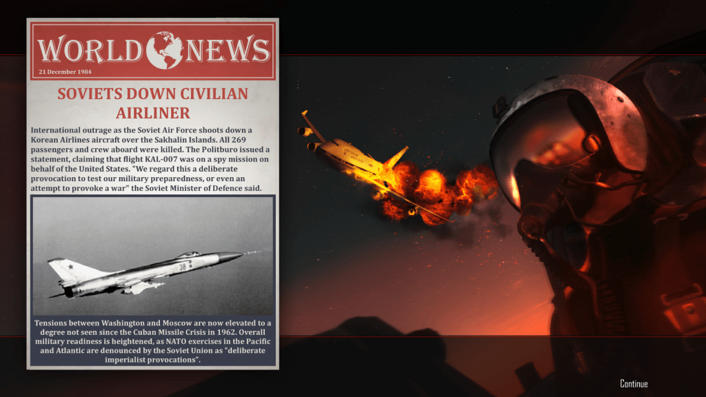 Although Beating the Odds is not part of the Campaign (indeed, it’s set nine months before the game’s version of World War III starts), the assumption is that as a result of various real-life Cold War incidents and disputes (including Reagan’s 1980 election, his “Evil Empire” description of the Soviet Union, the Korean Air Lines Flight 007 shootdown by Russian fighters, Reagan’s Strategic Defense Initiative proposal, and U.S. deployment of Pershing II intermediate range ballistic missiles to West Germany), the Kremlin invades West Germany and declares war on NATO.