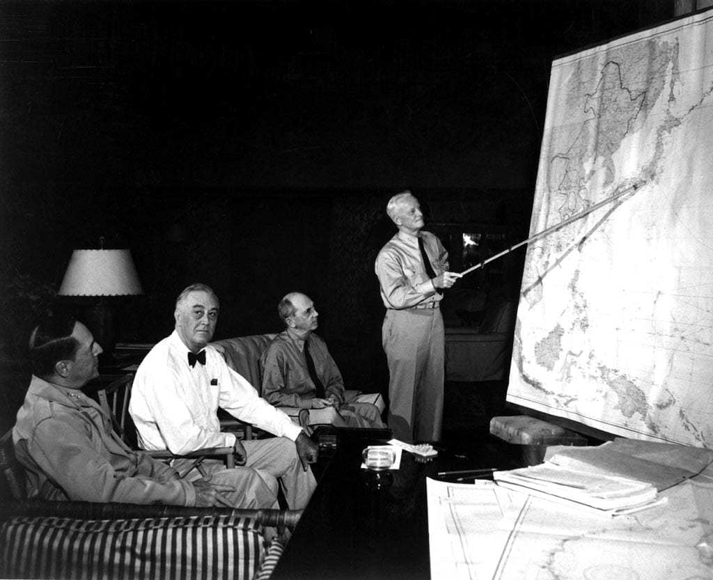 First, it had a legitimate military purpose; Roosevelt, as Commander-in-Chief, wanted to hear from Nimitz and MacArthur’s ideas about the next phase in the Pacific War. Since the summer of 1942, the U.S. had adhered to a de facto “twin drives” strategy in which Nimitz’s Pacific Fleet and its attached Marine Corps and Army ground forces, supported by the U.S. Army Air Force, drove westward across the South Pacific, while in the Southwest Pacific, MacArthur’s command, which included American and Australian forces supported by the U.S. Seventh Fleet and the U.S. Fifth Air Force, “island-hopped” from Australia to Papua-New Guinea and nearby archipelagos in a bid to reach MacArthur’s ultimate objective: the Philippines.