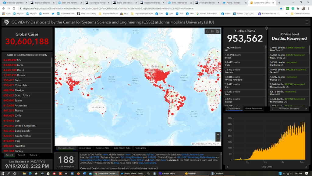 Here are the latest COVID-19 statistics from Johns Hopkins University’s COVID-19 Dashboard by the Center for Systems Science and Engineering (CSSE), as of 3:23 PM Eastern on September 19: