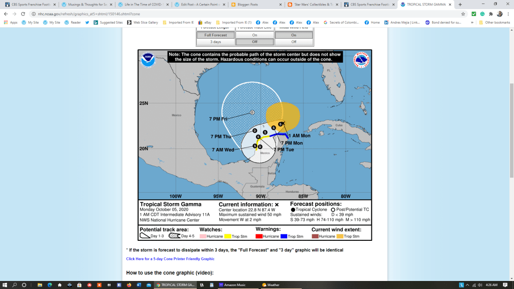 Hello, there, Dear Reader. It’s early in the morning (4:20 AM Eastern) as I start this post on Monday, October 5, 2020. Outside, the temperature is 74 degrees Fahrenheit (23 degrees Celsius) under cloudy skies. Humidity is at 91%, and with a northeasterly breeze blowing from the northeast at 10 MPH/16 KPH, the feels-like temperature is also 74 degrees Fahrenheit (23 degrees Celsius). Although Tropical Storm Gamma is moving well away from the U.S. – it never was a threat to the Gulf Coast, but its bands of moisture were interacting with a weather front over the state of Florida – we can still expect scattered showers here in my corner of Florida.