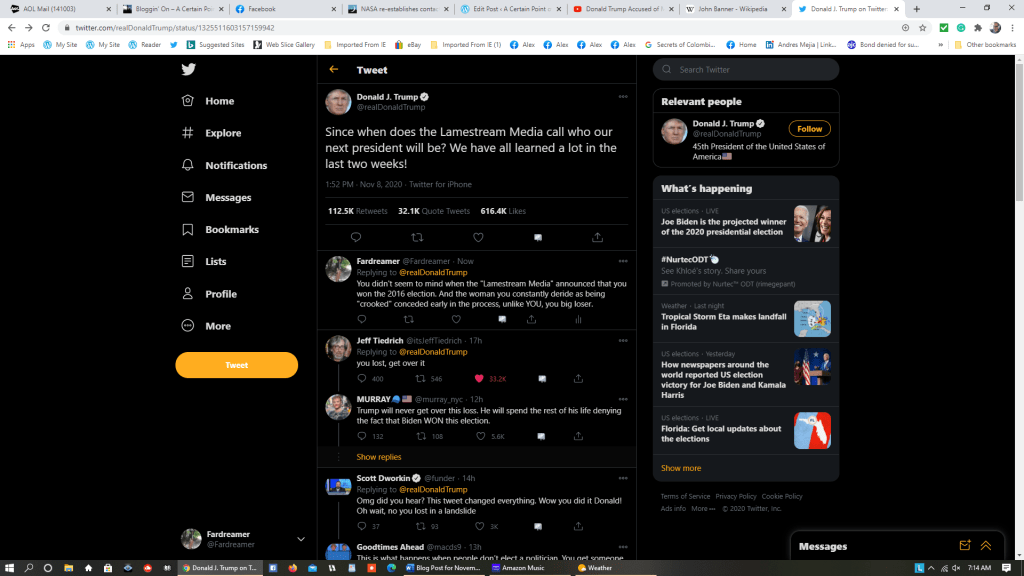 It’s six days after Election Day 2020, and President Donald J. Trump is still refusing to concede defeat, even though former Vice President Joe Biden and Kamala Harris are the projected winners of the Presidential election and the Electoral College doesn’t finalize the process till the electors cast their votes on December 14. His reaction to the loss has been predictably Trumpian – he continues to tweet accusations that there was massive voter fraud involving the mail-in ballots, and he spent quite a bit of time last night on Twitter, retweeting clips from Trump-friendly conservative commentators repeating the “we wuz robbed” conspiracy theories and railing against the media for “calling” the election.