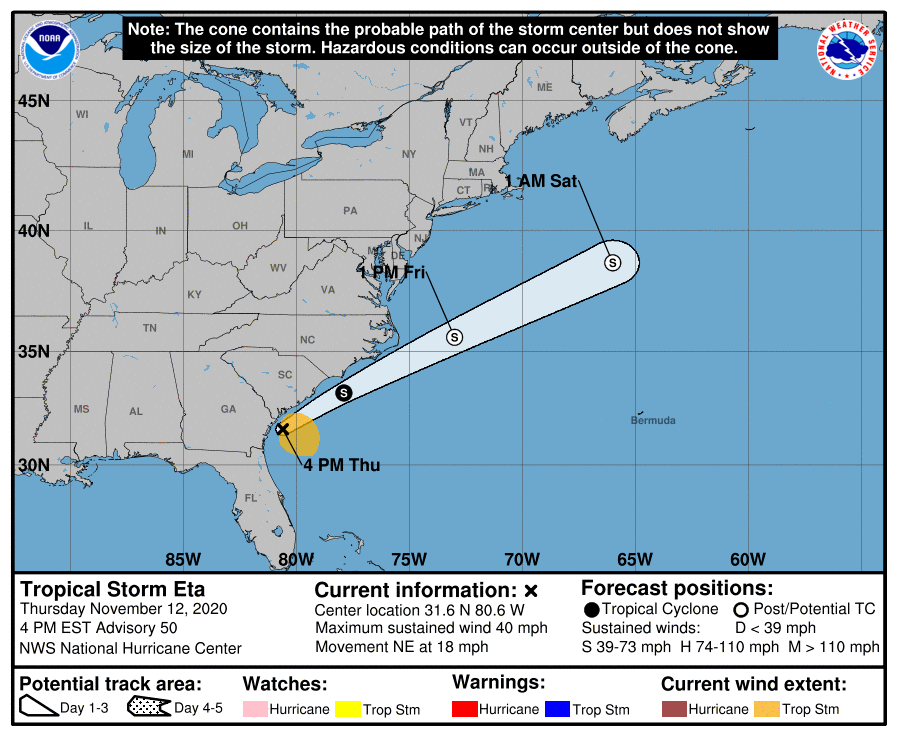 At 100 PM EST (1800 UTC), the center of Tropical Storm Eta was