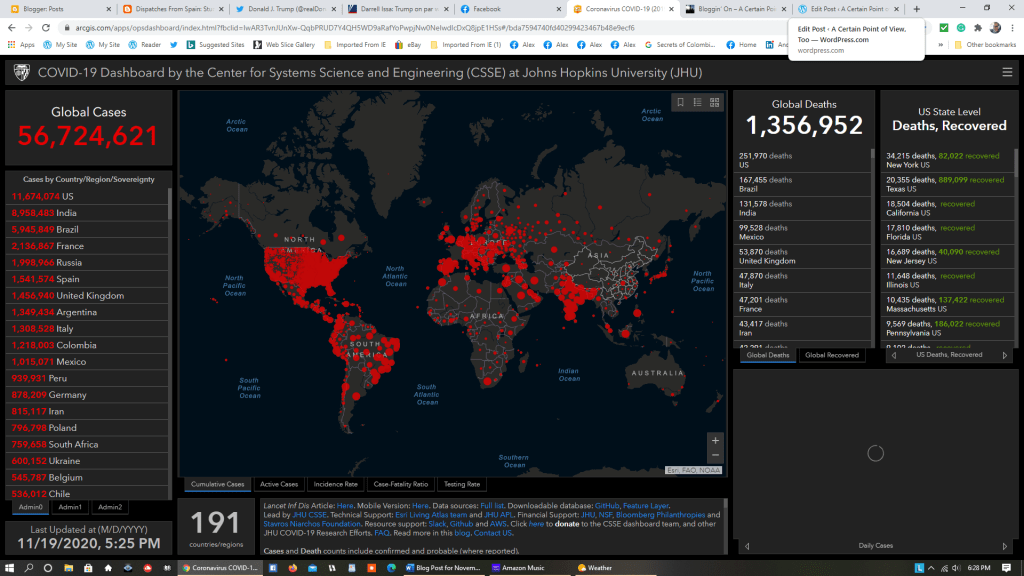 Not only do we have political shenanigans to worry about, but we also still have the COVID-19 pandemic still not anywhere under control. As of 5:25 PM Eastern, this is where we are on November 19, 2020: