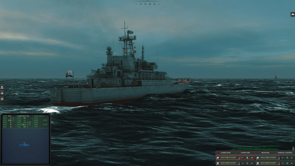 At 1100 hours (local time), USS Hyman G. Rickover (SSN-709), a Flight-1 Los Angeles-class attack submarine, detected several surface contacts on her passive sonar. Her skipper, CDR Alex Diaz-Granados, ordered the fire control crew to perform a Target Motion Analysis on the first contact, Sierra One, which was 10,000 yards off the starboard bow and sailing at 11 knots on a heading of 220 degrees.
