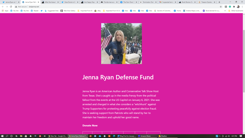 2 responses to “After the Assault on the Capitol: Accused Capitol Rioter Jenna Ryan Keeps Tweeting, Begs for Donations”