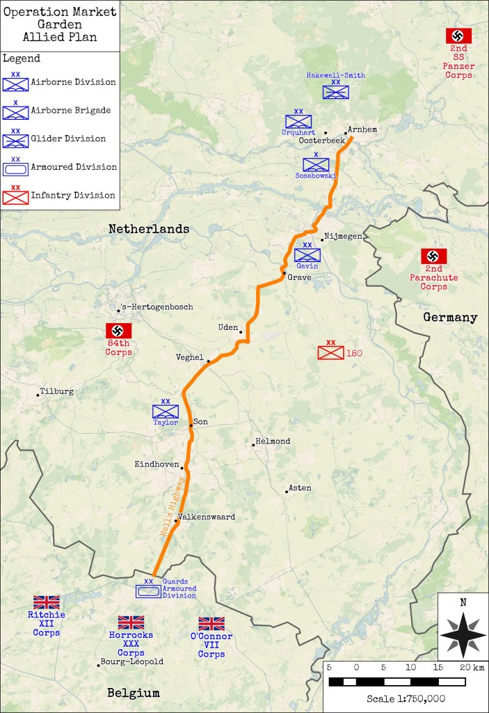 - Market, which was designed to use three of the First Allied Airborne Army’s six divisions (the U.S. 82nd and 101st Airborne, the British 1st Airborne and – as a follow-on force once the Allies had captured Arnhem – 52nd (Lowland) Division[1]) and the 1st Polish Brigade. The “airborne” element would, per Montgomery’s plan, seize a series of bridges over several major canals and and rivers – most notably the Waal near Nijmegen and the Lower Rhine at Arnhem – along a 64-mile-long highway