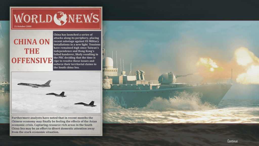 In this version of history, China is far more assertive and militarily aggressive than it really was in the last years of the 20th Century. As a result, Taiwan declares its independence and Great Britain postpones the 1997 handover of Hong Kong to China. This strains the relations between the Chinese government and the West, and eventually, several political and economic crises arise in East Asia. Inevitably, diplomacy fails, and these rising tensions lead to war between China and the United States.