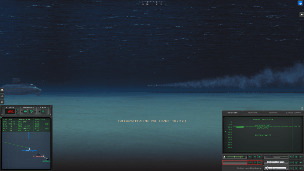 At around the same time I was “harpooning” the freighter, I fired at the subs before they could kill me. One, a Kilo-class diesel-electric sub, never even tried to counterattack. Neither did a Romeo-class boat. The third boat, as I mentioned earlier, did fire a three-torpedo spread blindly, but Hampton had fired a Mark-48 first, and our torpedo killed the Chinese sub (they were all diesel-electric SSKs) and the three torps had no one to guide them via control wires. I’m not a naval officer in real life, but I have books about modern naval combat, and I’ve learned some of the basic concepts of late 20th Century submarine warfare from them. Knowing how homing torpedoes work – and how to evade them – helps when playing Cold Waters.