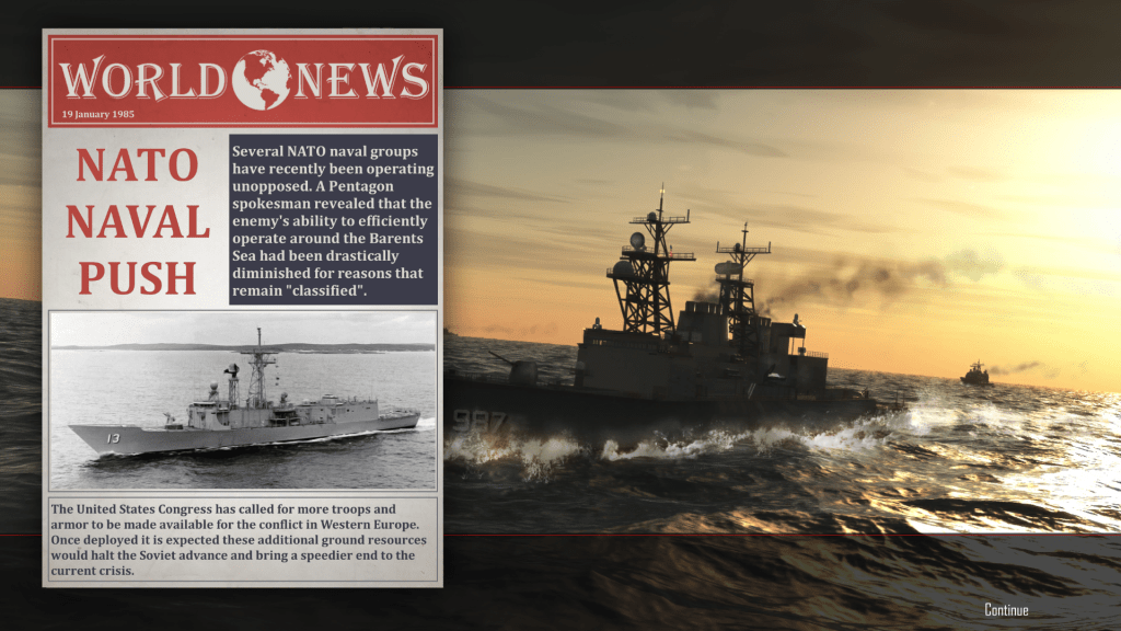 As I wrote earlier this week, I’m playing through the game’s North Atlantic 1984 campaign. This is a depiction of a hypothetical World War III that breaks out one month after Ronald Reagan’s re-election as President between the Soviet Union and NATO. As in the South China Sea 2000 scenario, this campaign begins at a real point in world history (in this instance, the really tense last years of the Cold War), then tweaks reality so that the fictional war between East and West can occur.