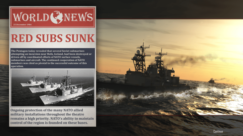 [1] Cold Waters features three Campaigns, each one reflecting the politics and naval technology of the year indicated in the Campaign names. The first one is North Atlantic 1984 and is the one that most resembles Tom Clancy’s 1986 novel Red Storm Rising and the eponymous 1988 PC game from MicroProse. (The reasons for the war are grounded on the real situation during the Reagan years and just tweaks history enough for an East-West clash, but some of the Cold Waters missions are similar to Red Storm Rising’s.); the second one – which seems to be the toughest – is North Atlantic 1968, which again pits the U.S. Navy against the Soviet Red Banner Northern Fleet but limits both sides to the vessels, aircraft, and weapons of 1968; and – of course – South China Sea 2000, which depicts an alternate history in which the Soviet Union didn’t fall but became a vassal of the People’s Republic of China and the Hong Kong turnover did not occur in 1997.