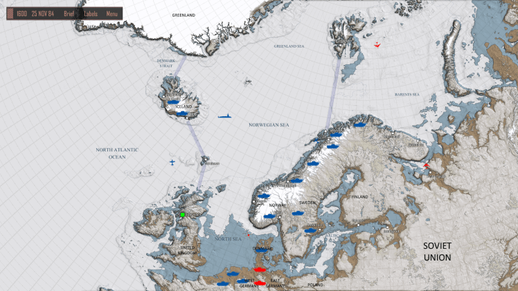 After a late breakfast of toast, cereal, orange juice, and coffee, I decided to complete the North Atlantic 1984 campaign in Cold Waters, my go-to computer video game that simulates modern submarine warfare in several Cold War-turns-hot scenarios.[1] Think of Cold Waters as a spiritual heir to MicroProse Software’s Red Storm Rising; the game’s Australian-based designers over at Killerfish Games certainly do!