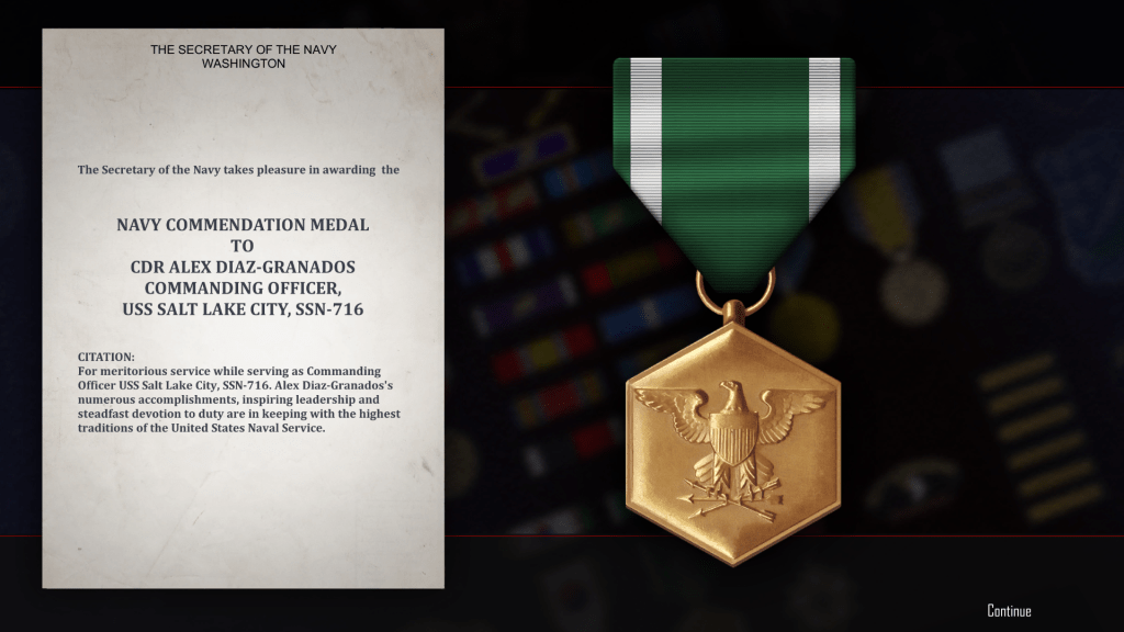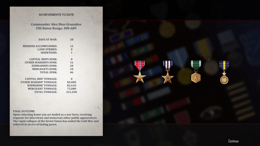 However, there were several onscreen cutscenes – stills – which suggest that we did survive, and that my record as a successful wartime skipper allowed me to escape repercussions to my career in the Navy. Plus, the war ended, as I said, in a draw.