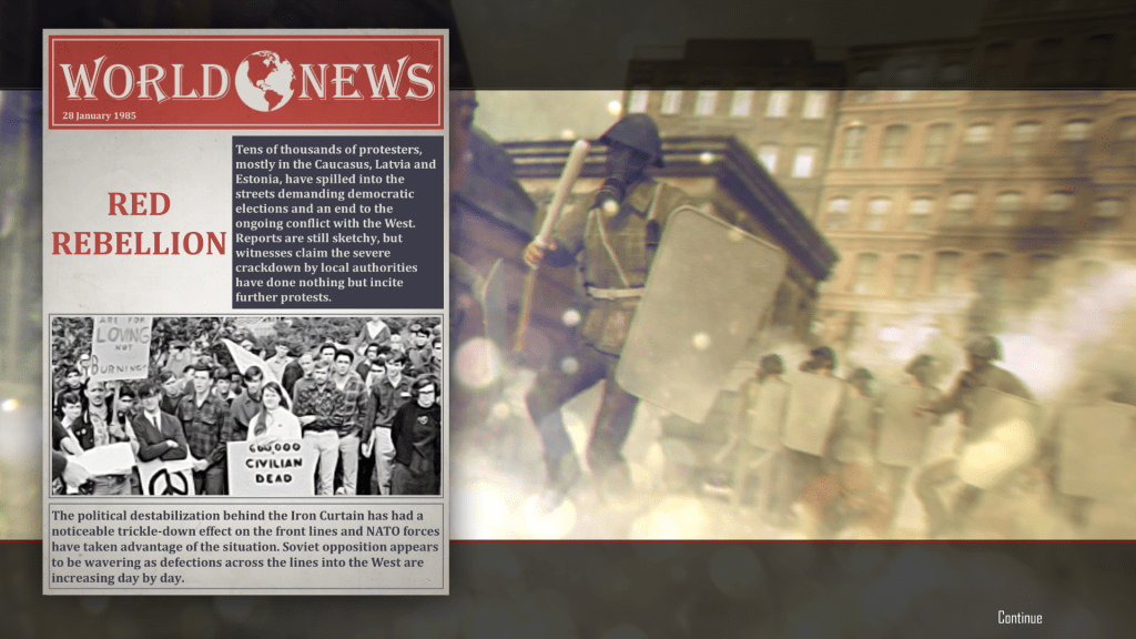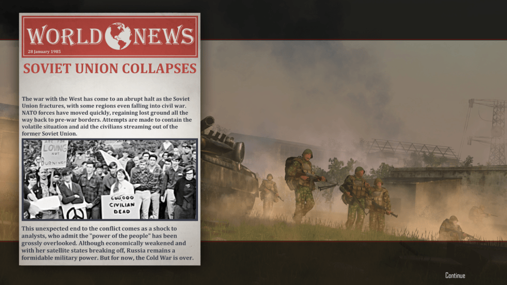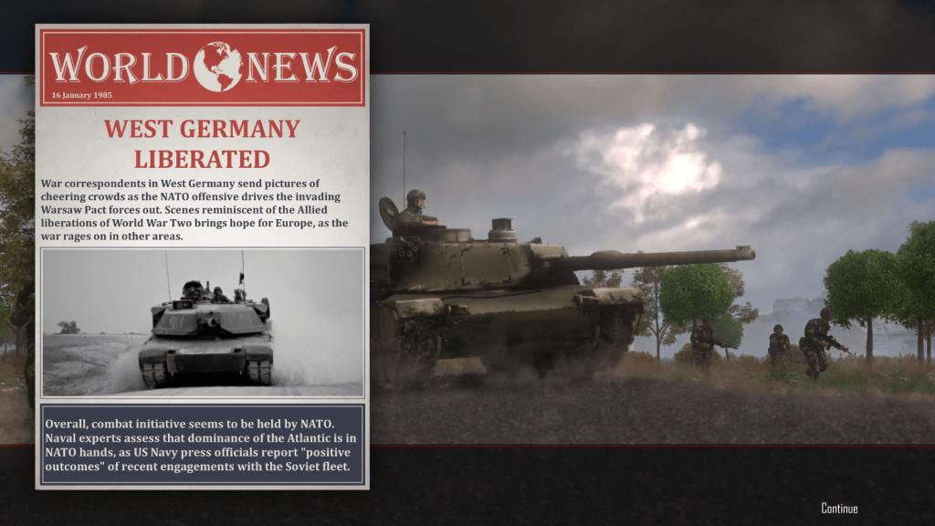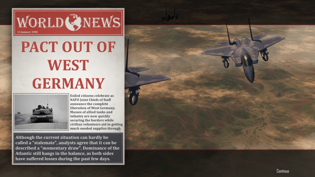 That’s when I learned that the game has several possible endings, based on how well (or how badly) a player performs against the AI Soviets. If you have more failed missions than successful ones, at the end of the war the Soviet Union wins. If you have a good war record but lose the last mission, the war ends in a draw, with the USSR getting some concessions – such as being able to occupy whatever NATO territory they hold at game’s end, and the Cold War continues.