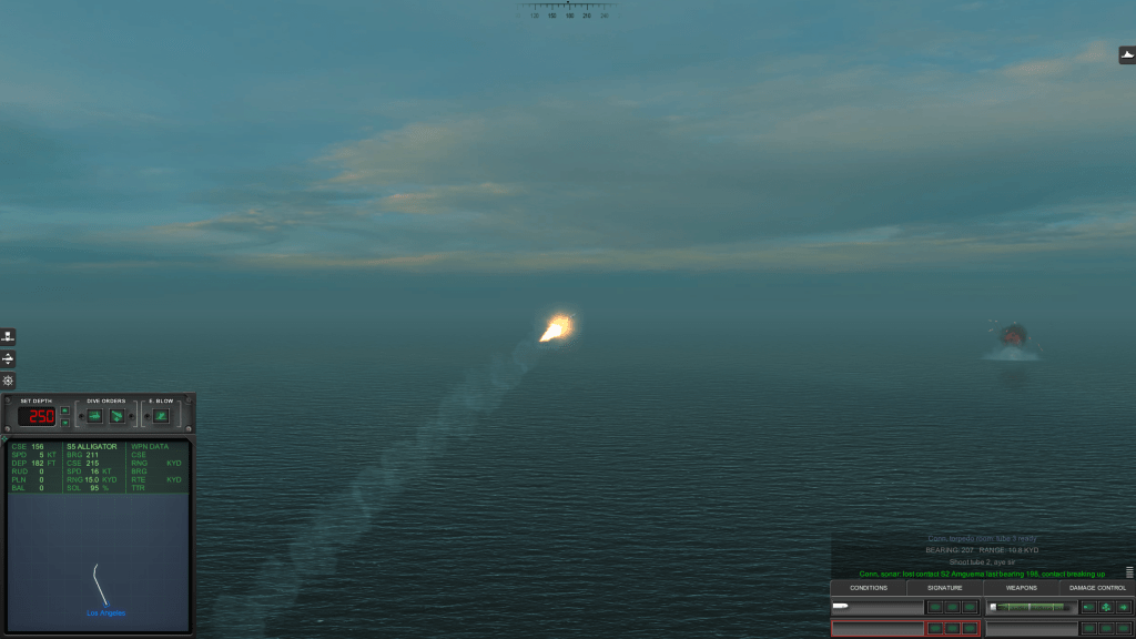 As I said before, the Alfa had fired several torpedoes at me; only one when it first detected Baton Rouge, then two more when it heard the “transient” from my own torpedo launch. All those weapons crisscrossing in the Delta’s vicinity must have spooked the captain, and the sub became visible in “external mode” when she started speeding up to avoid being hit.