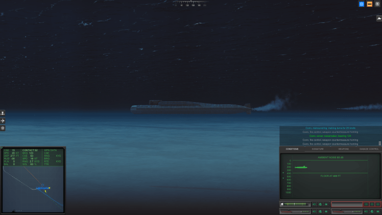 Now, the game lets you see what’s going on outside of your boat – like a movie, which is one of the reasons I love Cold Waters – from different vantages. F1 lets you see your boat; F2 lets you see an enemy contact (even if the sonar operator has not classified it by identifying its sound signature), F3 lets you follow torpedoes or missiles, and F4 shows you enemy ASW patrol planes and helicopters. I like to use those views (even though you can’t do that in real life) to ID enemy warships or aircraft by sight, so I checked to see what was going on with one of my Mk-48 torpedoes.
