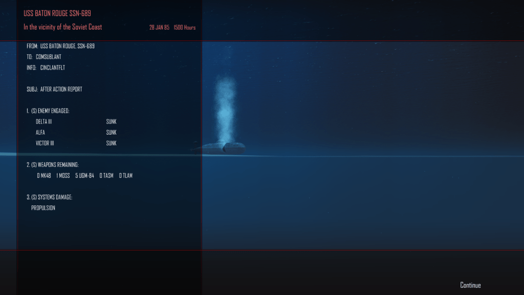 This account is getting more detailed than either you or I would prefer, so I’ll cut to the chase. I bagged the Alfa, the boomer, and a second escort (a Victor III, I think. I don’t keep detailed game logs, so….). Baton Rouge suffered one hit that caused her to lose 38% of her hull integrity, but she survived. I evaded the other “fish” the Russians fired at us, waited till they ran out of fuel and self-destructed, then hit Leave Combat.