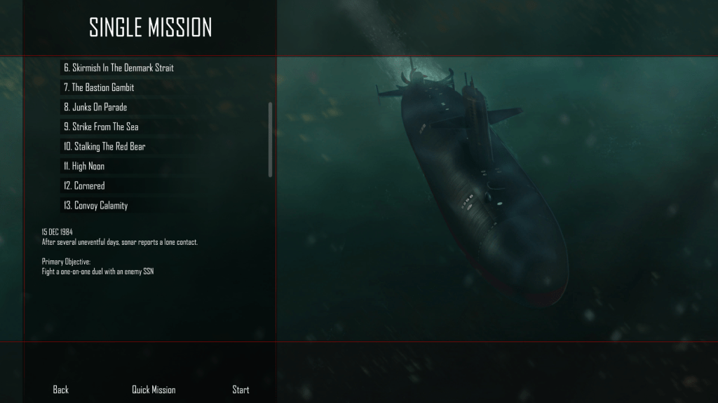 Until a few days ago, I’ve played Cold Waters assuming that there are only eight missions in the Single Mission menu, starting with #1 The Duel and ending with #8 Junks on Parade.