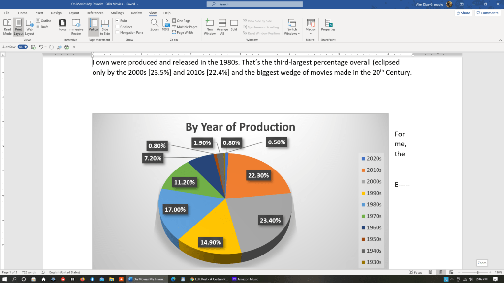 According to a pie chart in the Statistics page of my Blu-ray.com Blu-ray Collection, 17% of the movies I own were produced and released in the 1980s. That’s the third-largest percentage overall (eclipsed only by the 2000s [23.5%] and 2010s [22.4%] and the biggest wedge of movies made in the 20th Century.