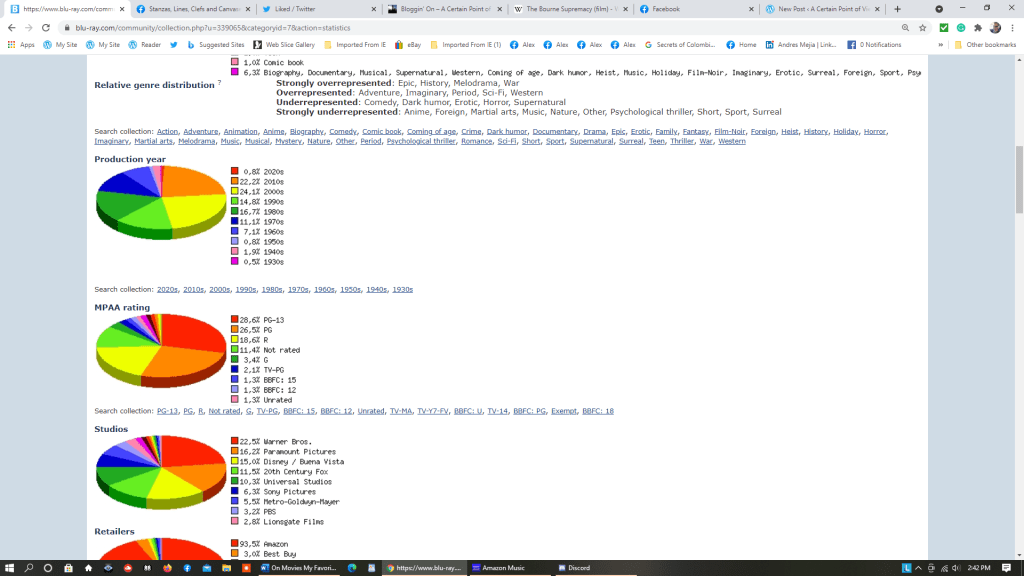Turning again to that most useful visual aid – the colorful pie chart on my Blu-ray.com account’s My Collection statistics page – we see that of all the decades from which I have movies on Blu-ray discs, the 2000s get the biggest “slice”: 24.1% of the titles in my Blu-ray collection were produced and released between 2000 and 2009.