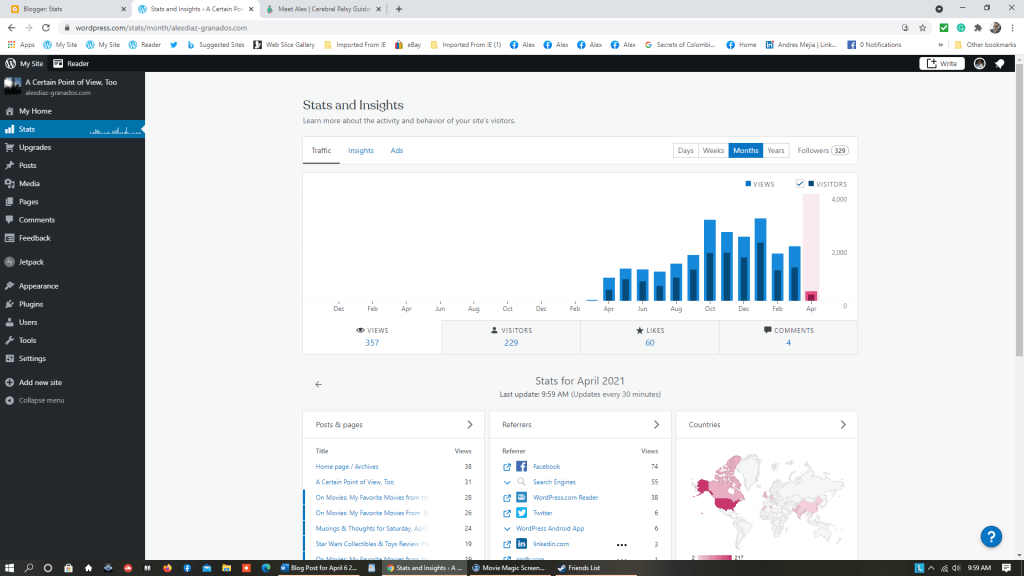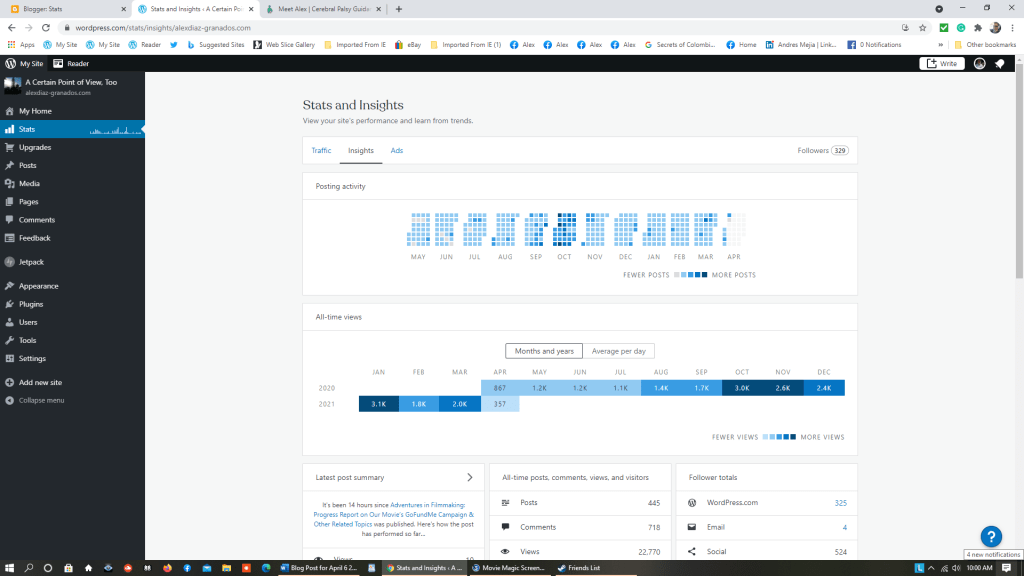 As you can see from the screenshots of my WordPress Statistics page, in many ways A Certain Point of View, Too is doing better than its counterpart on Blogger. For instance, here I have 329 followers (325 on WordPress itself; four subscribe to my posts by email); there I have only 24 followers.