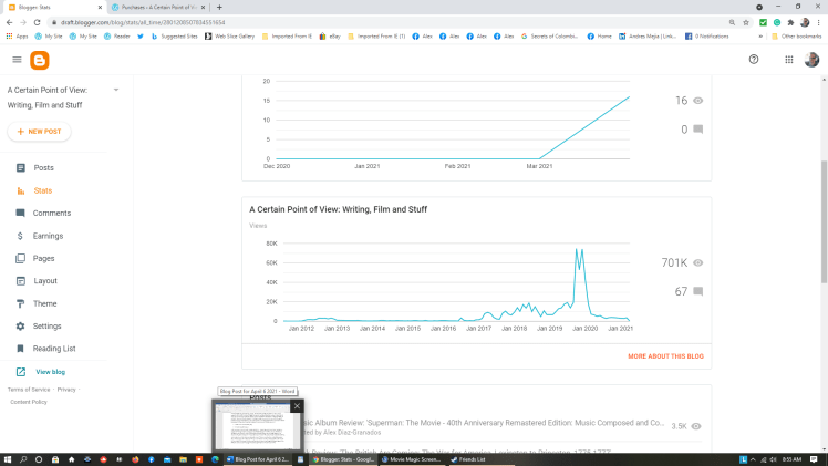 As you can see, A Certain Point of View (which I started shortly before my mother got sick in early 2010) had a long, slow gestation period and didn’t really “take off” until 2016. That’s because when I began the blog, I was still writing at Epinions, a review site that I had been a contributor for since December 2003 and, sadly, closed in February of 2014 because its presence on Google was affected by changes in that search engine’s algorithms and also because eBay – its corporate owner – just didn’t find it profitable to pay its contributors anymore. (I also used to write for the now-vanished Associated Content/Yahoo Voices, Bubblews, and the closest equivalent to being a reporter in the entertainment beat that I ever became, writing for Examiner.com as its Miami reporter [or Examiner] in the Books, Blu-ray & DVD, and Star Wars beats.)