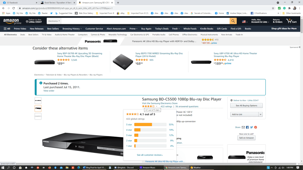 Less than a month before my trip to Georgia was set to begin, I ordered the aforementioned Samsung BD-C5500 1080p Blu-ray Disc Player and a HDMI cable so Mom could watch any of my Blu-ray films and even have a few of her own in her small collection of home media releases. I also bought her a DVD/Blu-ray rack to store her discs on. It arrived about a week later – Amazon had not debuted its own Amazon Prime delivery service and relied on UPS, the mail, or a crappy company called Lasership to deliver orders to customers, and because I knew how to set the Blu-ray player up, I happily surprised Mom with her new “toy” and connected the Samsung BD-C5500 1080p Blu-ray Disc Player to her TV.