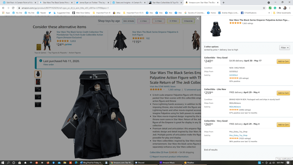 Interestingly, while I was on Amazon looking over my old orders from last year, I was astounded to learn that the Emperor Palpatine with Throne (and Sith lightning) I bought for $58.20 in February of 2020 to put up on my Ikea floating shelf above my TV now costs…ready? Between $240 and $260!