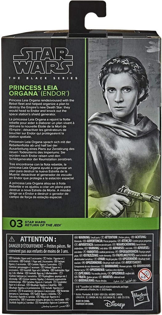 On the reverse side, we see the usual Star Wars The Black Series “info panel” stuff, with the character description blurb (Princess Leia Organa helped the rebels organize a plan to destroy the Empire’s new Death Star: knocking out the space station’s shield generator on Endor.) printed in English, French, German, Spanish, and Portuguese along the left side, with a detail from the side panel illustration on the right. Below that, we see that this is figure 03 of this new line from Hasbro, plus copyright and product info in many languages, including Greek, Arabic, Polish, Italian, Greek, Romanian, Swedish, and Finnish.
