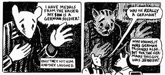 Maus has recognized the true nature of that riddle by casting its protagonists as animalsโmice, cats, pigs, and dogs. As Spiegelman has said (in an interview in The New Comics, p. 191): “To use these ciphers, the cats and mice, is actually a way to allow you past the cipher at the people who are experiencing it.” When Maus first appeared as a three-page comic strip in an underground anthology, the words “Nazi” and “Jew” were never mentioned. Spiegelmanโs animals permit readers to bypass the question of what human beings can or cannot do and at the same time force them to confront it more directly. His Jewish mice are a barbed response to Hitlerโs statement “The Jews are undoubtedly a race, but they are not human.” His feline Nazis remind us that the Germansโ brutality was at bottom no more explicable than the delicate savagery of cats toying with their prey. And although Vladek Spiegelman and his family initially seem even more human than the rest of us, as the story unfolds they become more and more like animals, driven into deeper and deeper hiding places, foraging for scarcer and scarcer scraps of sustenance, betraying all the ties that we associate with humanity.
