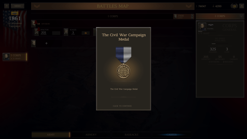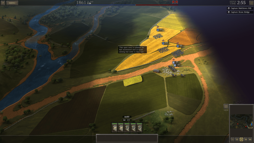 Perhaps this is because I watched a few of The Historical Gamer’s “Let’s Play” series videos about Ultimate General: Civil War, but I managed to achieve a draw at the First Battle of Bull Run as the Union commander. I still have to play a few more sessions before I can win a battle outright, but so far I have played First Bull Run three times, and each time I perform just a bit better.