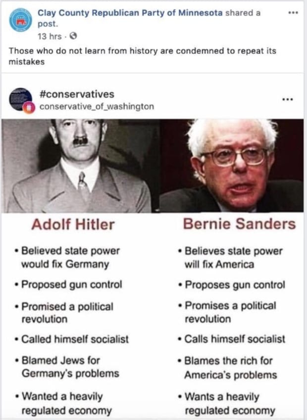 Here’s a “Hitler was a socialist” meme. This was posted in a GOP-affiliated Facebook page, Clay County Republican Party of Minnesota.