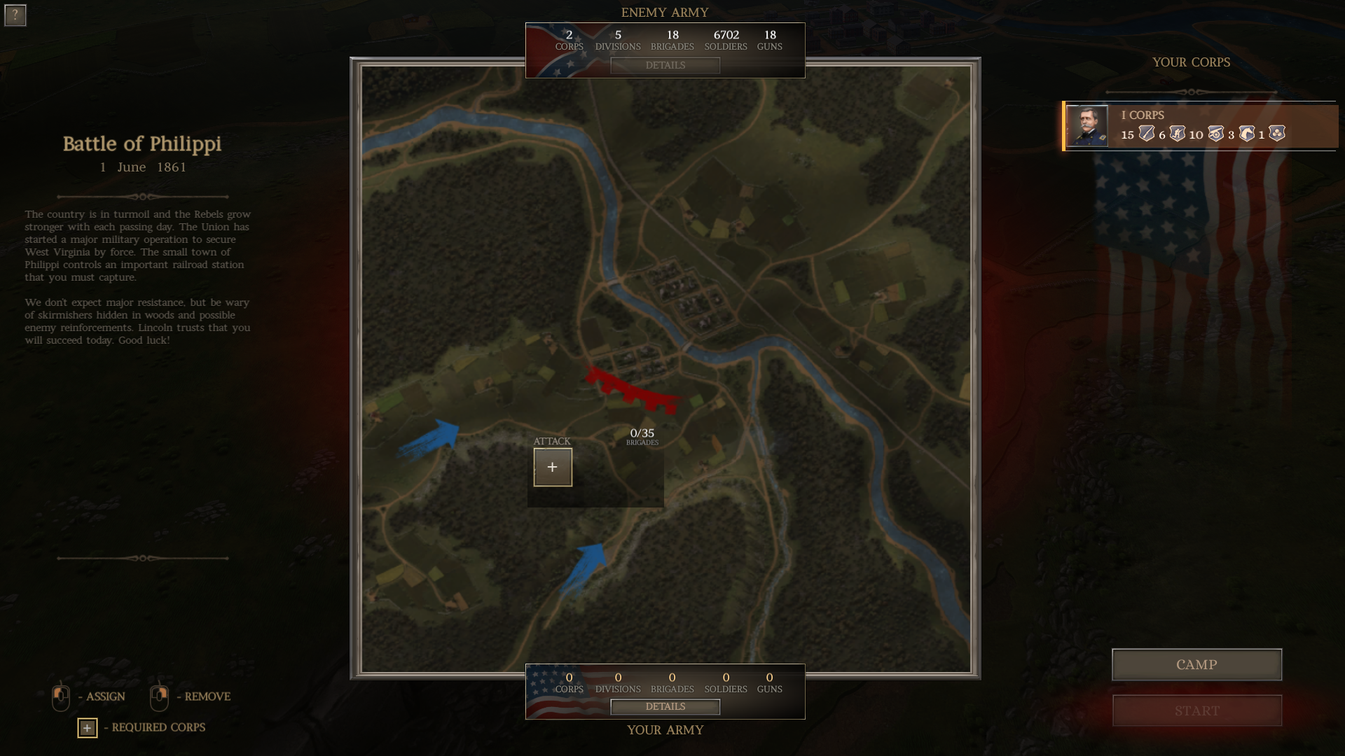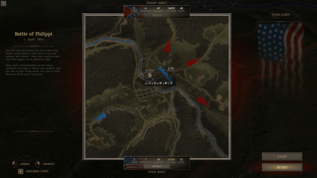 Since I am more familiar with modern (20th and 21st Century) warfare and have not played a lot of Civil War games, I am not ready to tackle the Campaign game in Ultimate General: Civil War. Instead, I am going to take it slow and progress from small engagements – such as the Battle of Philippi – and then ease my way up to the larger battles of Shiloh, Antietam, and Gettysburg.