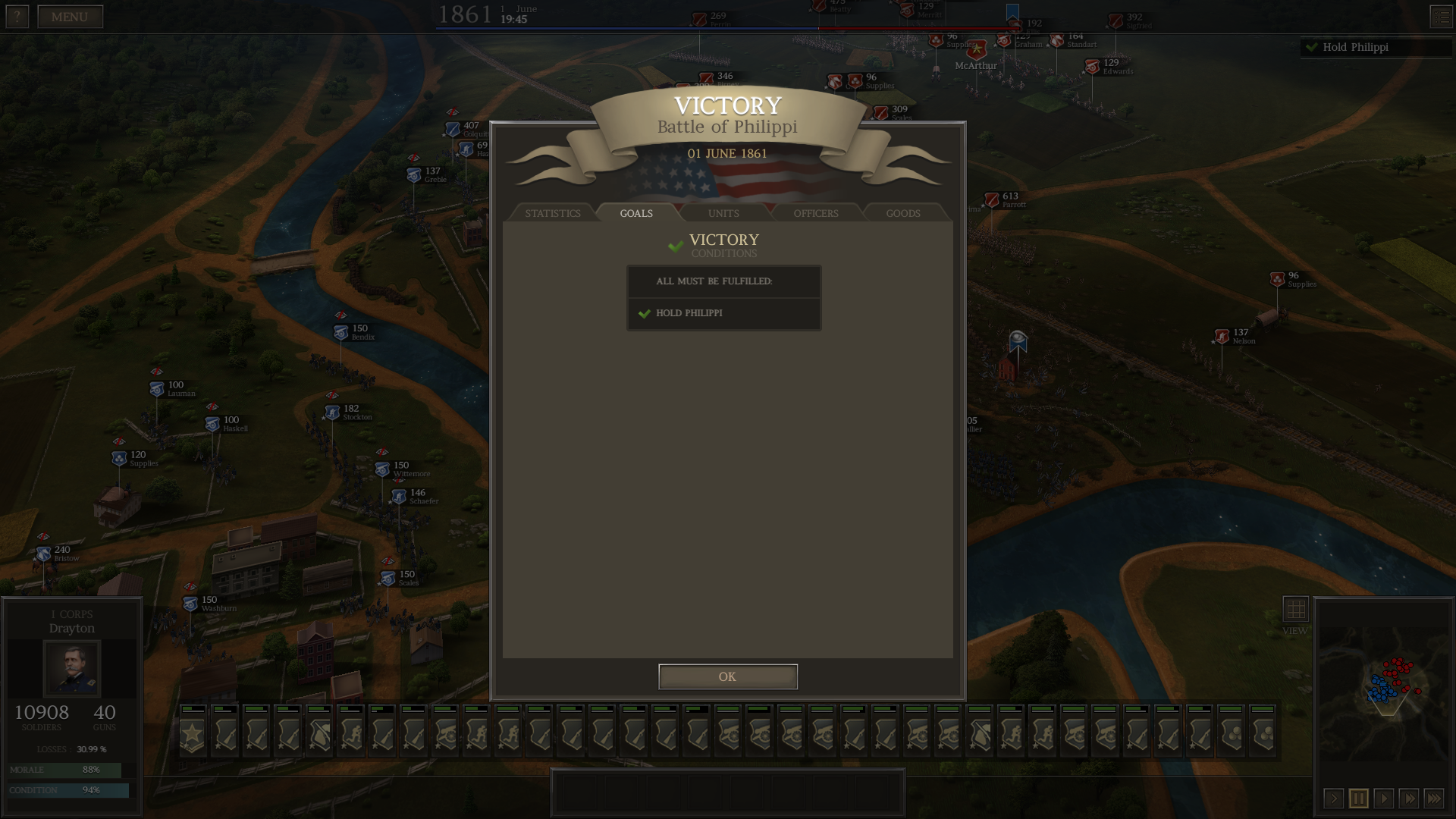 Like Gen. George B. McClellan in real life, I won the Battle of Philippi, but it was a bloody affair. Far too bloody, in fact. The Confederates even used an armored train to wreak havoc on my Union forces, and one of my regimental commanders was killed in battle.