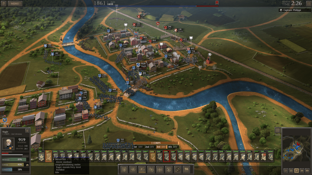 At each stage, I had to figure out how to deal with different battle situations. For instance, in “Approaching Philippi,” do I deploy my entire initial force to deal with the Confederate skirmishers and cavalry outside of the town, or do I detach a division to deal with them and march on to the main objective? In “Capturing Philippi,” how long do I wait to send my troops across the Tygart Valley River and into the heart of the town itself? Where do I site my artillery batteries for maximum effect? How do I prevent being flanked by those pesky Rebels? And, most importantly, when is the best time to order my infantry regiments to charge?