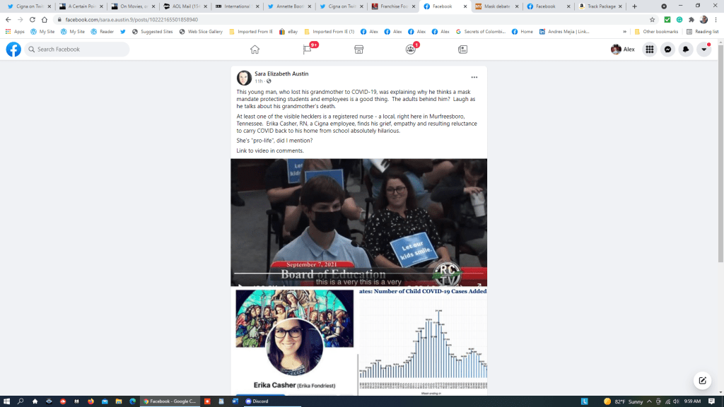 A couple of days ago I learned about a Tennessee woman named Erika Casher, a registered nurse and a case worker for healthcare provider Cigna. She’s also an anti-mask “advocate” who earned instant notoriety on the Internet when she was caught on camera at a Rutherford County (Tennessee) Board of Education meeting where a debate over school mask mandates for students took place earlier this week.